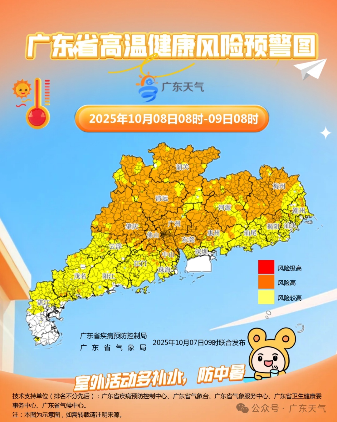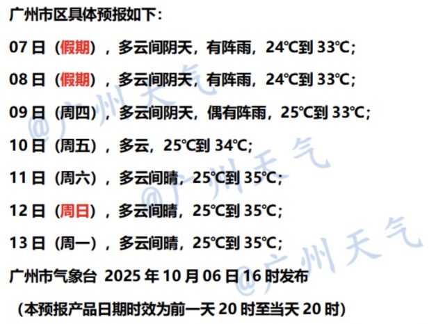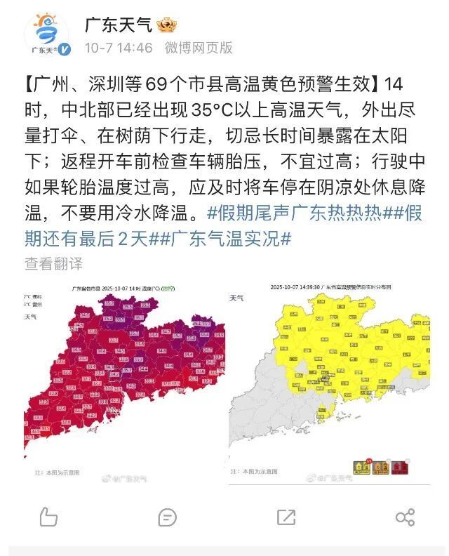 随着台风离开,广东天气热晴回归!预计,未来几天广东天气以多云为主,有分散(雷)阵雨,大部市县最高气温介于33~36℃,体感炎热。注意高温时段减少户外活动,注意检查车辆胎压、防晒补水和防火。