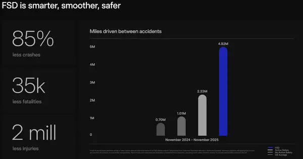 马斯克表示,特斯拉在允许车主边开车边发短信之前会"查看数据"。在股东大会上,特斯拉为了体现其 FSD 功能的安全性,公布了最新数据,数据显示,在开启 FSD 功能下,特斯拉车辆每行驶 492 万英里(约 792 万公里)才发生一次碰撞,而美国车辆的这个平均水平在每行驶 70 万英里(约 113 万公里)发生一次碰撞。据此,特斯拉表示,FSD 减少了 85% 的碰撞。