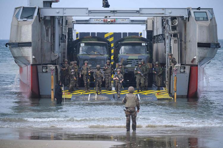 6月12日,法国普卢伊内克,陆军士兵在海滩上从驳船登陆,参加北约军事演习。来源:视觉中国