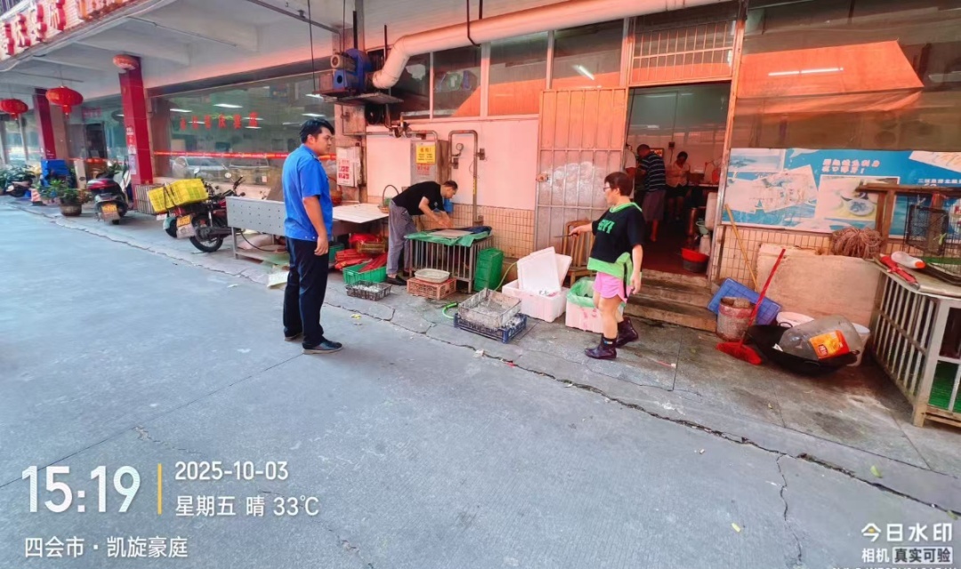 2025年10月3日,接东城街道群众反映,四会市陶丽凯旋豪庭楼下商铺存在圈养家禽行为。经执法人员现场核实,该商铺确于店外圈养家禽3只,系为筹备婚宴临时所需。依据《肇庆市城市市容和环境卫生管理条例》第三十五条规定,鉴于其非长期饲养行为,四会市城管局现场作出限期改正处理。