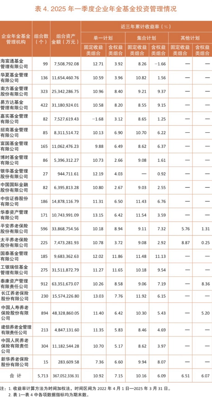 这是企业年金基金首次按“近三年累计收益率”公布投资业绩。近三年累计收益率采用时间加权法计算,时间区间为2022年4月1日—2025年3月31日,即该指标非年化收益率。